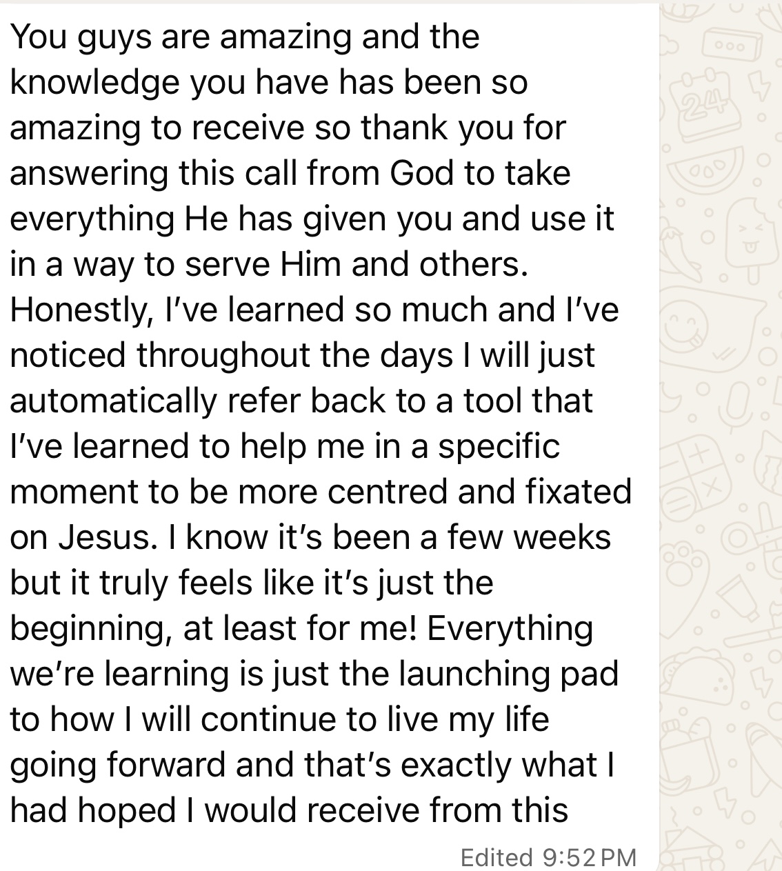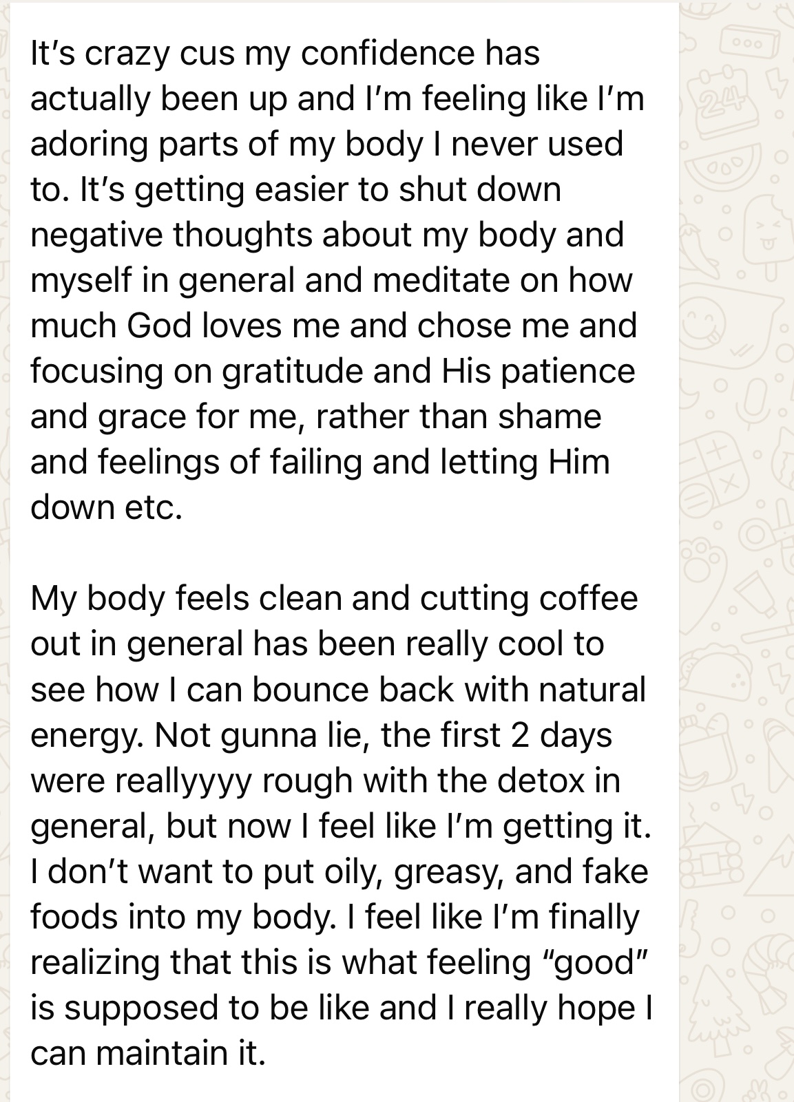 “I realized the ways I have been self-sabotaging my health and the unworthiness to be unhealthy and negative self-images I’ve held to for so long. The breakthrough for me was realizing I have control and power with the help of the Holy Spirit”